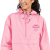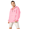 Protect yourself from the elements with this Pink "Dancing in the Rain" embroidered Champion packable jacket. This wind and rain resistant polyester jacket with a detailed embroidery design has a practical hood, front kangaroo pocket, and zipped pouch pocket which you can pull out and use to scrunch the jacket into for convenient storage.